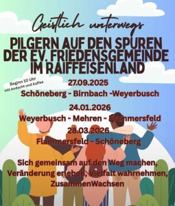 „Pilgern auf den Spuren der Friedensgemeinde Raiffeisenland“ heißt es in den kommenden Monaten. „Gemeinsam unterwegs – im Vertrauen und im Glauben“ startete am letzten September-Samstag, mit einer Wanderung von Schöneberg nach Weyerbusch. Andachten, das Kennenlernen von besonderen Örtlichkeiten (z.B. ging es bei der ersten Wanderung auch um das Schöneberger Schloss) und fröhliches Miteinander stehen im Mittelpunkt der Wanderungen, die die Gemeinschaft der aktuell noch drei Kirchengemeinden fördern soll. -> MEHR zur ersten Wanderung und zu den nächsten Terminen im Winter und Frühjahr