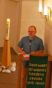 Auch der traditionelle „Heuberg-Gottesdienst“ fand diesmal in der Birnbacher Kirche statt. Hier legten Regen- und Gewitterwarnungen einen Umzug nahe. Verbunden war der Gemeinschaftsgottesdienst der drei Gemeinden diesmal mit der Verabschiedung des Flammersfelder Gemeindepfarrers Karsten Matthis (Bild) in den Ruhestand. Pfarrer hatte sich einen „kleinen Abschied“ im Rahmen des Gemeinschafts-Gottesdienstes gewünscht. ->MEHR dazu