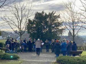 Da die Außentemperaturen plötzlich sehr angestiegen waren, traf man sich diesmal lieber in statt bei der Kirche und genoss so bei angenehmem Drumherum das Zuhören, Mitsingen und Rätselraten um Melodien.