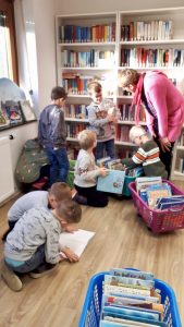 Im Anschluss durften dann die Kinder ungezwungen auf „Bücher-Pirsch“ gehen: Das bunte „Kinderangebot“ stand allen offen und es wurde nach Herzenslust gestöbert und geschmökert. Überall in der Bücherei gab es (improvisierte) Lese-Ecken und eifriges Blättern.